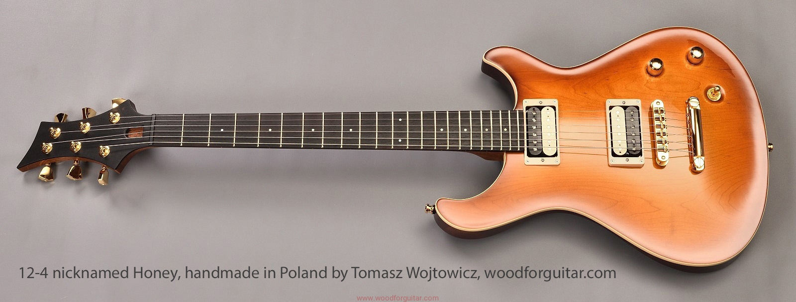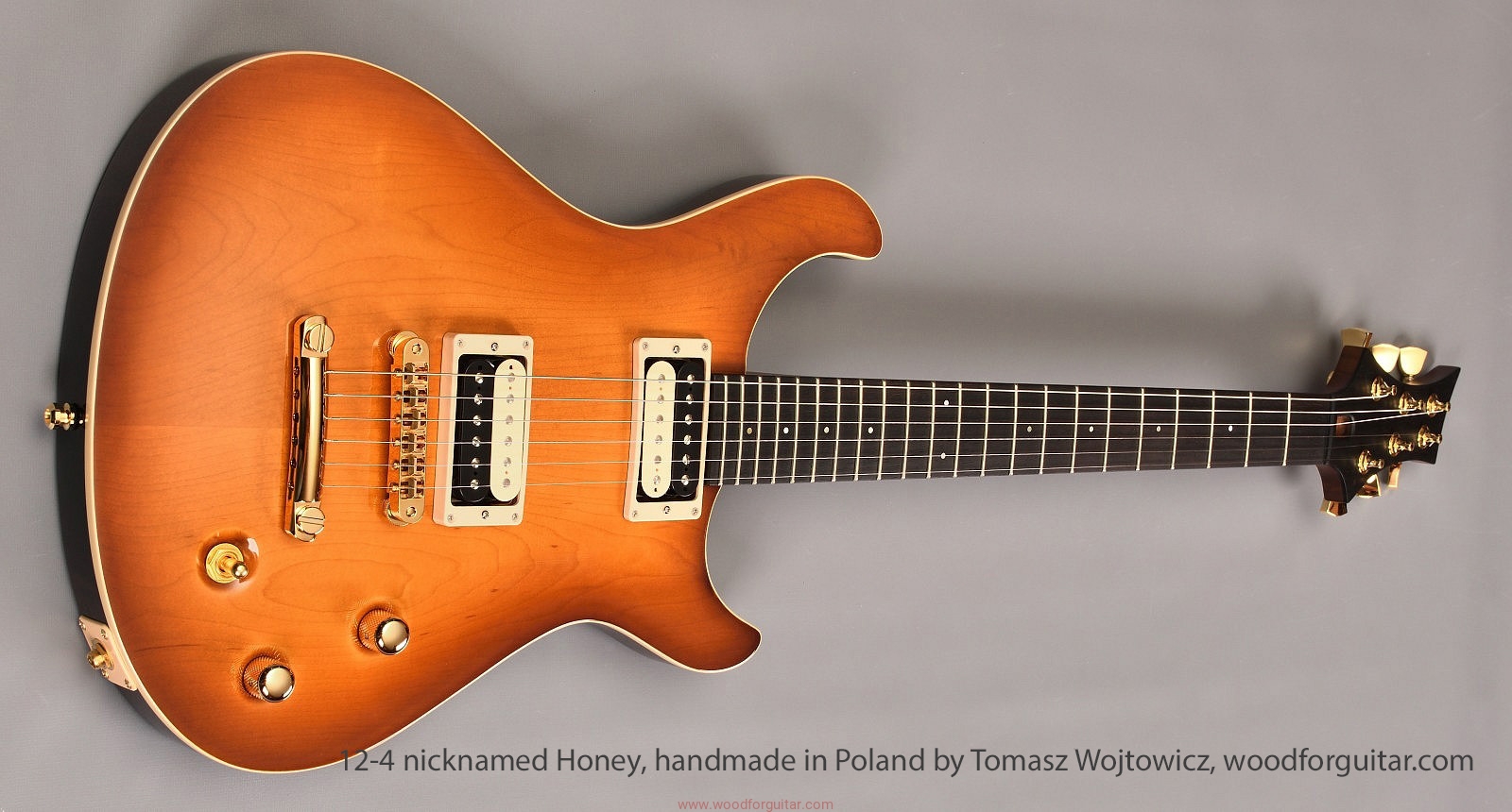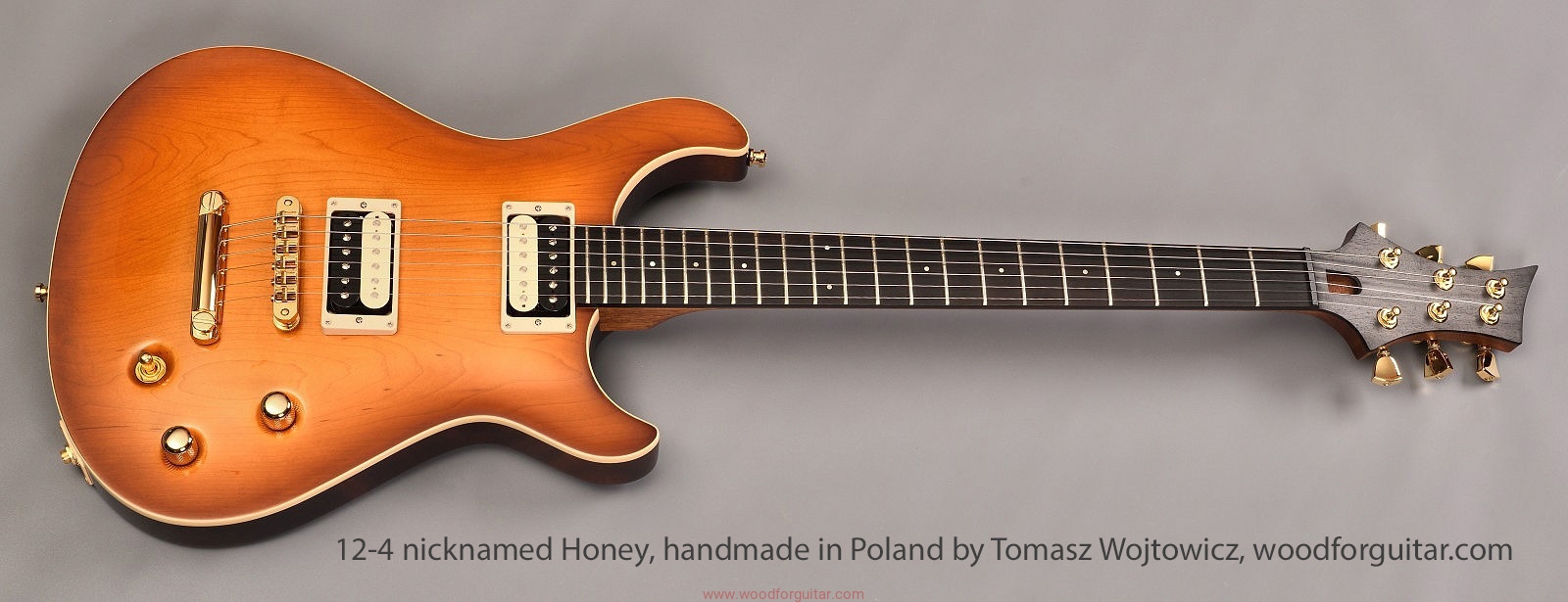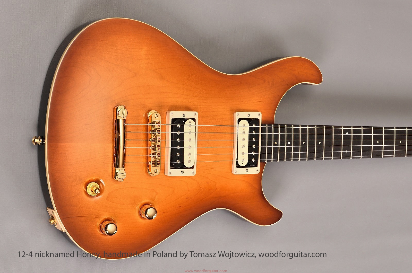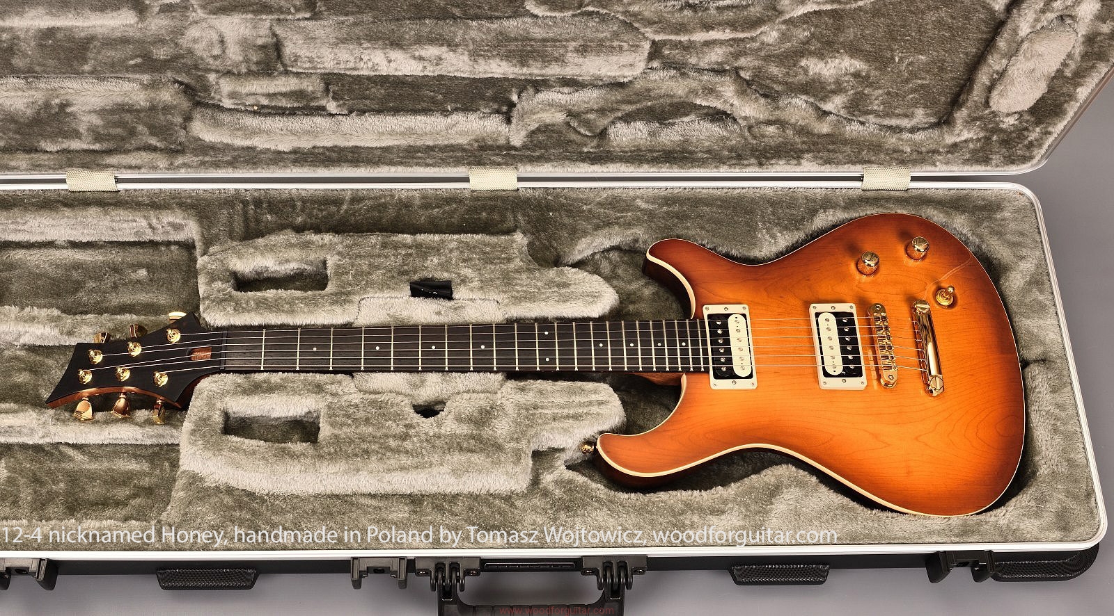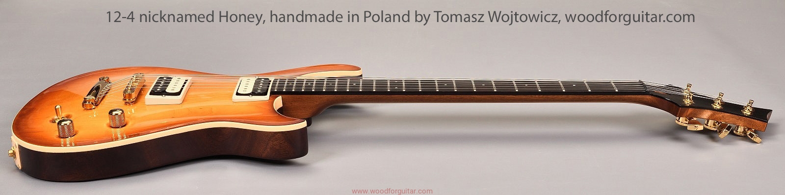Sześciostrunowa gitara elektryczna o numerze seryjnym 12-4, nazwana „Honey”, wykonana ręcznie w Polsce przez Tomasza Wojtowicza, jedna z 25 gitar wchodzących w skład kolekcji „25 guitars collection – handmade by Tomasz Wojtowicz”. Wykonanie gitary zostało całkowicie zakończone w styczniu 2026r, gitara powstawała ponad 17 lat. Dlaczego tak długo? Bo jak zwykle w przypadku gitar z „25 guitars collection” każda z gitar w tej serii powstawała, powstaje i będzie powstawać niespiesznie, w chwilach wyjątkowych… kiedy jest czas i dobra energia. Honey to gitara stworzona do klasycznego rocka oraz bluesa, która została wykonana tradycyjnymi metodami, przy użyciu standardowych, ogólnie dostępnych narzędzi. Zalicza się do instrumentów oldschool’owych, wykonanych ręcznie bez użycia maszyn typu CNC. Dla jednych brzydki, dla innych to piękny efekt połączenia wiedzy, doświadczenia oraz cierpliwości, który jest stworzony głównie do intensywnego grania. W budowie instrumentu użyto klasycznych gatunków drewna wysokiej jakości, sezonowanych przez wiele lat w warunkach suchych. Jest to szczególny, oryginalny instrument, posiadający swój własny charakter, o brzmieniu ciepłym „mahoniowym”, grubym, „drewnianym” z dużą dozą górnolotnego jadu. Konstrukcja gitary, użyte materiały oraz osprzęt sugerują zastosowanie w gatunkach muzycznych, określanych ogólnie jako: classic rock, rock, blues oraz pokrewnych. Oczywiście, tu nie ma granic. W zależności od ustawień czułych potencjometrów, rodzaju i ustawień wzmacniacza, dodatkowych wspomagaczy, … można ukręcić brzmienia do zastosowania w przeróżnych projektach muzycznych. W gitarze zastosowano zestaw jednych z najlepszych na świecie niewoskowanych przetworników typu classic humbucker o niskim poziomie wyjściowym, a także wklejony gryf w standardowych rozmiarach, nie za cienkim, nie za grubym… lecz „w sam raz”. Gitara została wyposażona w osprzęt markowy topowej jakości. Honey to jedenasty instrument uruchomiony w rodzinie „25 guitars collection”, wcześniej uruchomione zostały: Bernard, Winston, Theodore, Leonard, Eddie, Ozzy, Tony, Tweety, Woody oraz Blondie. Pierwsze podłączenie do wzmacniacza ukazało prawdziwą naturę instrumentu, który okazał się być... dziwny. Co powiedziała Honey i dlaczego jest dziwna? „Mogę miękko szeptać. Mogę twardo krzyczeć. Ale nie będę oszukiwać i nie zamaskuję żadnego z twoich potknięć. Powiem więcej… brutalnie je podkreślę, czy to ci się podoba, czy nie”.