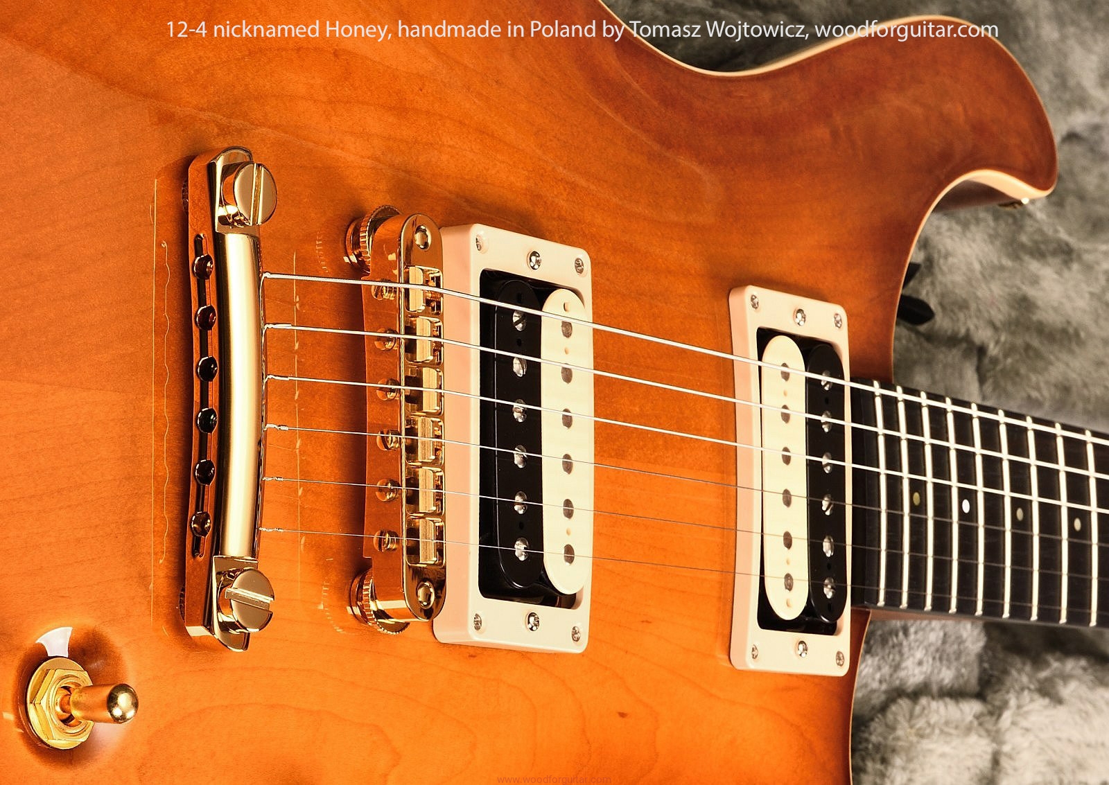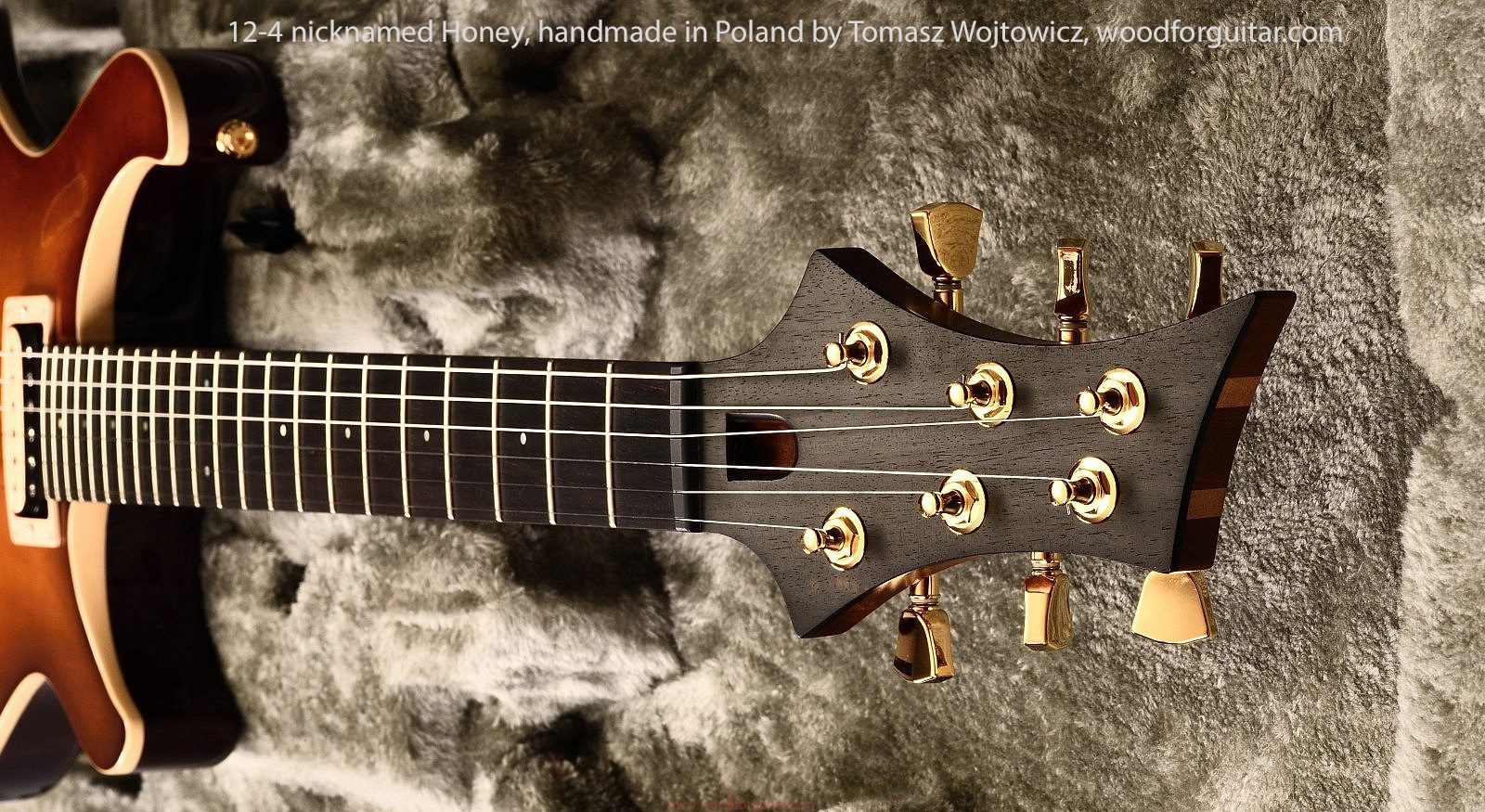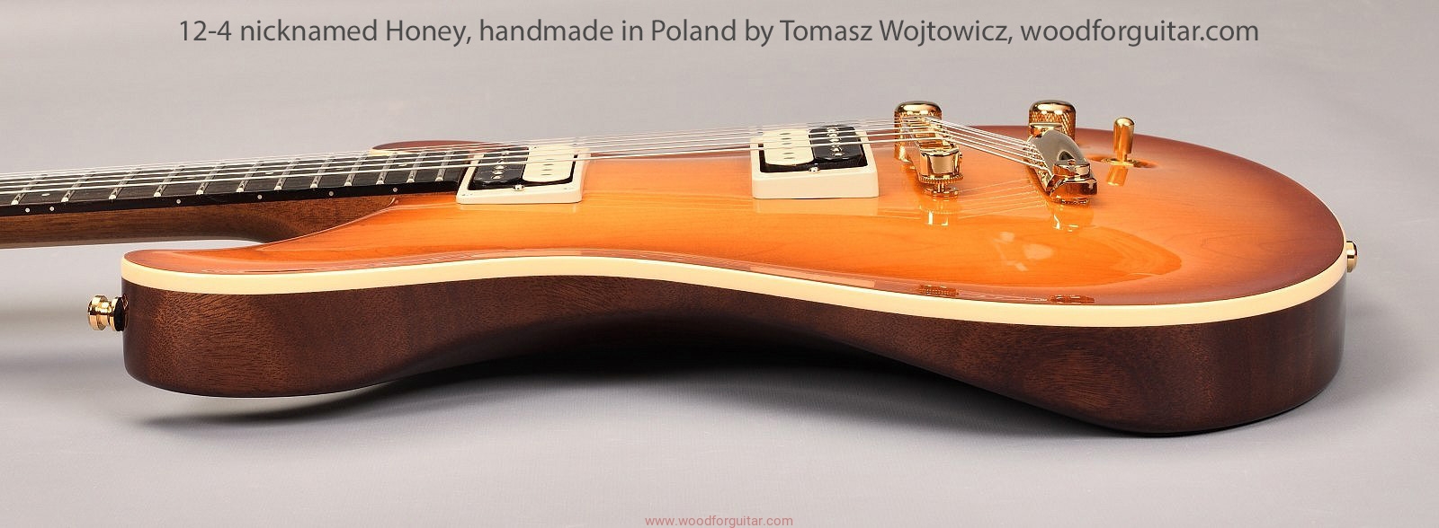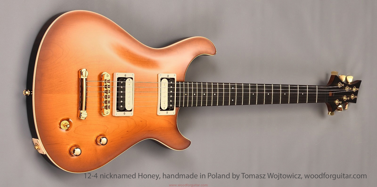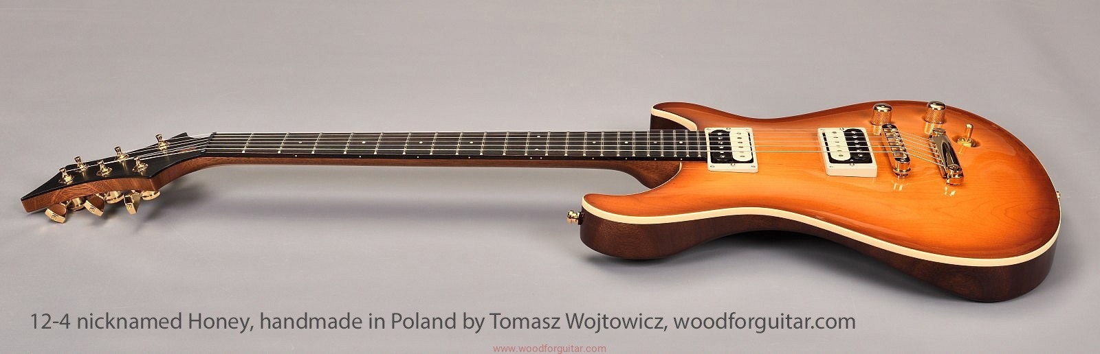 Sześciostrunowa gitara elektryczna o numerze seryjnym 12-4, nazwana „Honey”, wykonana ręcznie w Polsce przez Tomasza Wojtowicza, jedna z 25 gitar wchodzących w skład kolekcji „25 guitars collection – handmade by Tomasz Wojtowicz”. Wykonanie gitary zostało całkowicie zakończone w styczniu 2026r, gitara powstawała ponad 17 lat. Dlaczego tak długo? Bo jak zwykle w przypadku gitar z „25 guitars collection” każda z gitar w tej serii powstawała, powstaje i będzie powstawać niespiesznie, w chwilach wyjątkowych… kiedy jest czas i dobra energia. Honey to gitara stworzona do klasycznego rocka oraz bluesa, która została wykonana tradycyjnymi metodami, przy użyciu standardowych, ogólnie dostępnych narzędzi. Zalicza się do instrumentów oldschool’owych, wykonanych ręcznie bez użycia maszyn typu CNC. Dla jednych brzydki, dla innych to piękny efekt połączenia wiedzy, doświadczenia oraz cierpliwości, który jest stworzony głównie do intensywnego grania. W budowie instrumentu użyto klasycznych gatunków drewna wysokiej jakości, sezonowanych przez wiele lat w warunkach suchych. Jest to szczególny, oryginalny instrument, posiadający swój własny charakter, o brzmieniu ciepłym „mahoniowym”, grubym, „drewnianym” z dużą dozą górnolotnego jadu. Konstrukcja gitary, użyte materiały oraz osprzęt sugerują zastosowanie w gatunkach muzycznych, określanych ogólnie jako: classic rock, rock, blues oraz pokrewnych. Oczywiście, tu nie ma granic. W zależności od ustawień czułych potencjometrów, rodzaju i ustawień wzmacniacza, dodatkowych wspomagaczy, … można ukręcić brzmienia do zastosowania w przeróżnych projektach muzycznych. W gitarze zastosowano zestaw jednych z najlepszych na świecie niewoskowanych przetworników typu classic humbucker o niskim poziomie wyjściowym, a także wklejony gryf w standardowych rozmiarach, nie za cienkim, nie za grubym… lecz „w sam raz”. Gitara została wyposażona w osprzęt markowy topowej jakości. Honey to jedenasty instrument uruchomiony w rodzinie „25 guitars collection”, wcześniej uruchomione zostały: Bernard, Winston, Theodore, Leonard, Eddie, Ozzy, Tony, Tweety, Woody oraz Blondie. Pierwsze podłączenie do wzmacniacza ukazało prawdziwą naturę instrumentu, który okazał się być... dziwny. Co powiedziała Honey i dlaczego jest dziwna? „Mogę miękko szeptać. Mogę twardo krzyczeć. Ale nie będę oszukiwać i nie zamaskuję żadnego z twoich potknięć. Powiem więcej… brutalnie je podkreślę, czy to ci się podoba, czy nie”.