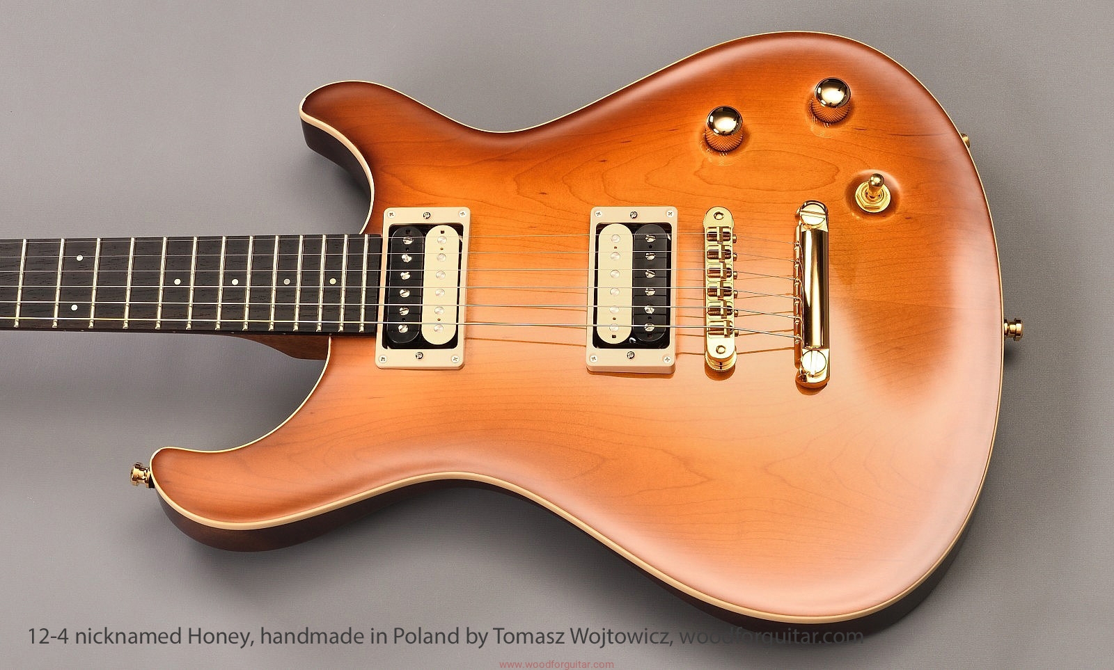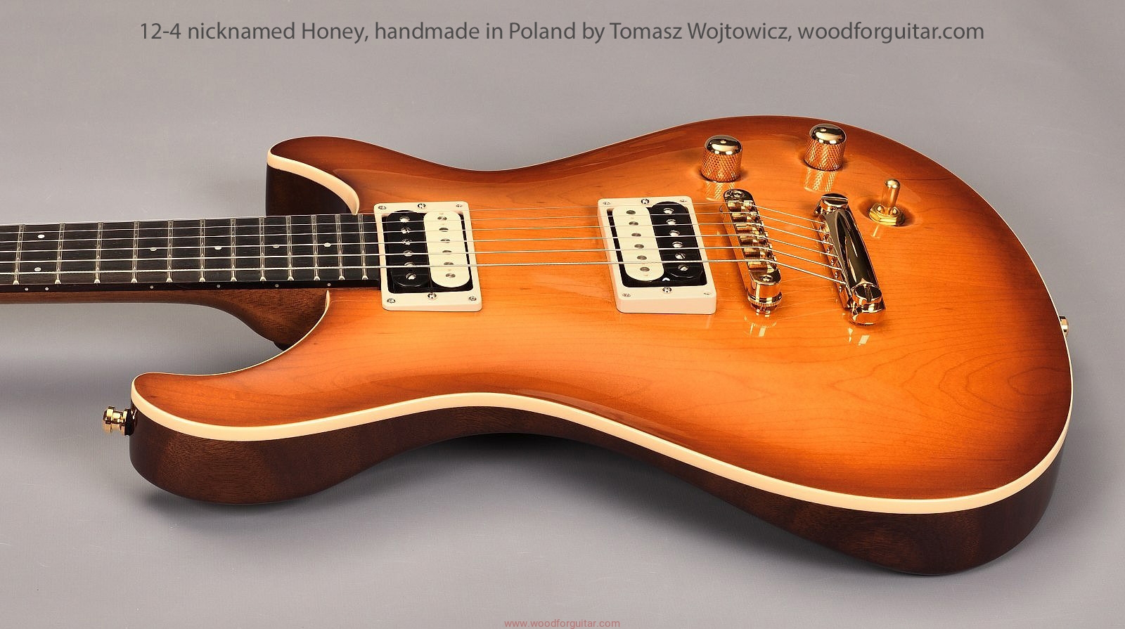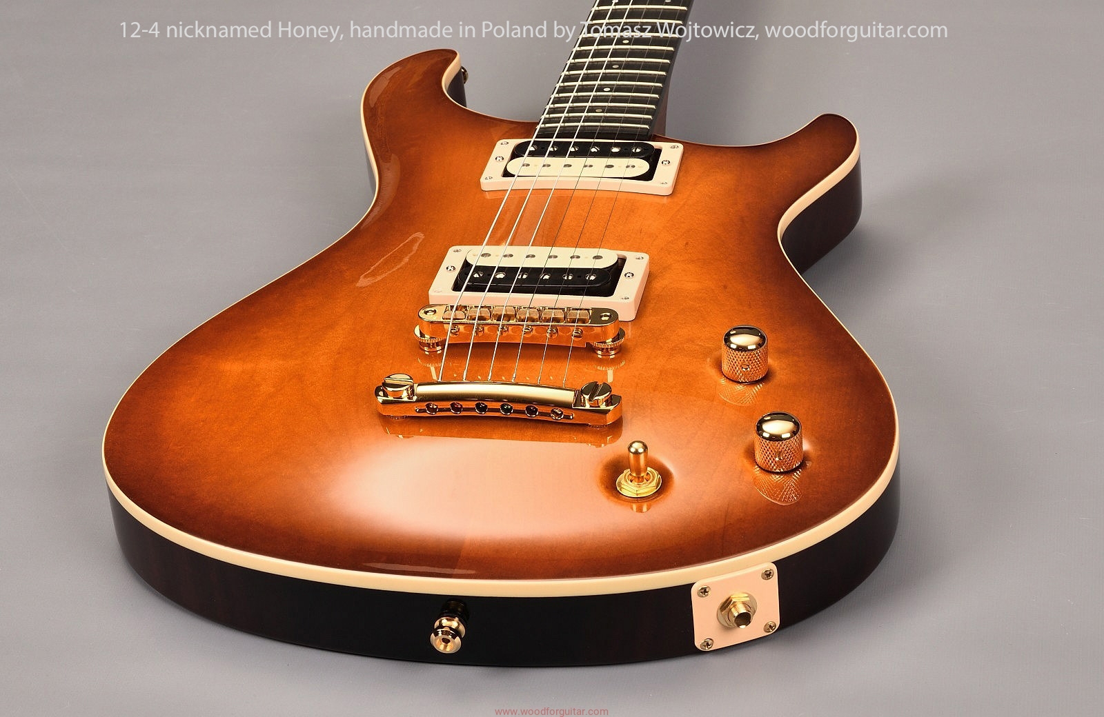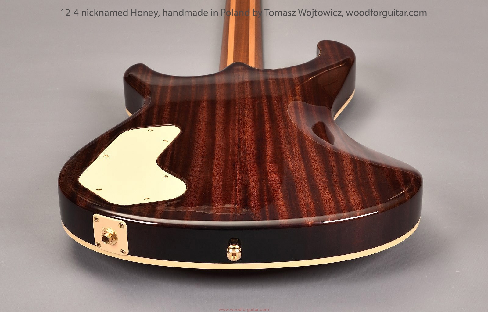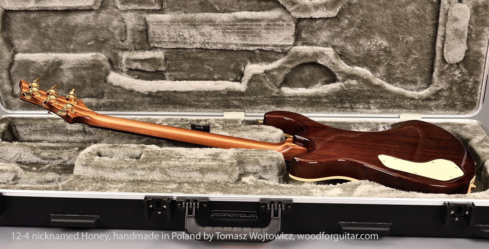 Sześciostrunowa gitara elektryczna o numerze seryjnym 12-4, nazwana „Honey”, wykonana ręcznie w Polsce przez Tomasza Wojtowicza, jedna z 25 gitar wchodzących w skład kolekcji „25 guitars collection – handmade by Tomasz Wojtowicz”. Wykonanie gitary zostało całkowicie zakończone w styczniu 2026r, gitara powstawała ponad 17 lat. Dlaczego tak długo? Bo jak zwykle w przypadku gitar z „25 guitars collection” każda z gitar w tej serii powstawała, powstaje i będzie powstawać niespiesznie, w chwilach wyjątkowych… kiedy jest czas i dobra energia. Honey to gitara stworzona do klasycznego rocka oraz bluesa, która została wykonana tradycyjnymi metodami, przy użyciu standardowych, ogólnie dostępnych narzędzi. Zalicza się do instrumentów oldschool’owych, wykonanych ręcznie bez użycia maszyn typu CNC. Dla jednych brzydki, dla innych to piękny efekt połączenia wiedzy, doświadczenia oraz cierpliwości, który jest stworzony głównie do intensywnego grania. W budowie instrumentu użyto klasycznych gatunków drewna wysokiej jakości, sezonowanych przez wiele lat w warunkach suchych. Jest to szczególny, oryginalny instrument, posiadający swój własny charakter, o brzmieniu ciepłym „mahoniowym”, grubym, „drewnianym” z dużą dozą górnolotnego jadu. Konstrukcja gitary, użyte materiały oraz osprzęt sugerują zastosowanie w gatunkach muzycznych, określanych ogólnie jako: classic rock, rock, blues oraz pokrewnych. Oczywiście, tu nie ma granic. W zależności od ustawień czułych potencjometrów, rodzaju i ustawień wzmacniacza, dodatkowych wspomagaczy, … można ukręcić brzmienia do zastosowania w przeróżnych projektach muzycznych. W gitarze zastosowano zestaw jednych z najlepszych na świecie niewoskowanych przetworników typu classic humbucker o niskim poziomie wyjściowym, a także wklejony gryf w standardowych rozmiarach, nie za cienkim, nie za grubym… lecz „w sam raz”. Gitara została wyposażona w osprzęt markowy topowej jakości. Honey to jedenasty instrument uruchomiony w rodzinie „25 guitars collection”, wcześniej uruchomione zostały: Bernard, Winston, Theodore, Leonard, Eddie, Ozzy, Tony, Tweety, Woody oraz Blondie. Pierwsze podłączenie do wzmacniacza ukazało prawdziwą naturę instrumentu, który okazał się być... dziwny. Co powiedziała Honey i dlaczego jest dziwna? „Mogę miękko szeptać. Mogę twardo krzyczeć. Ale nie będę oszukiwać i nie zamaskuję żadnego z twoich potknięć. Powiem więcej… brutalnie je podkreślę, czy to ci się podoba, czy nie”.