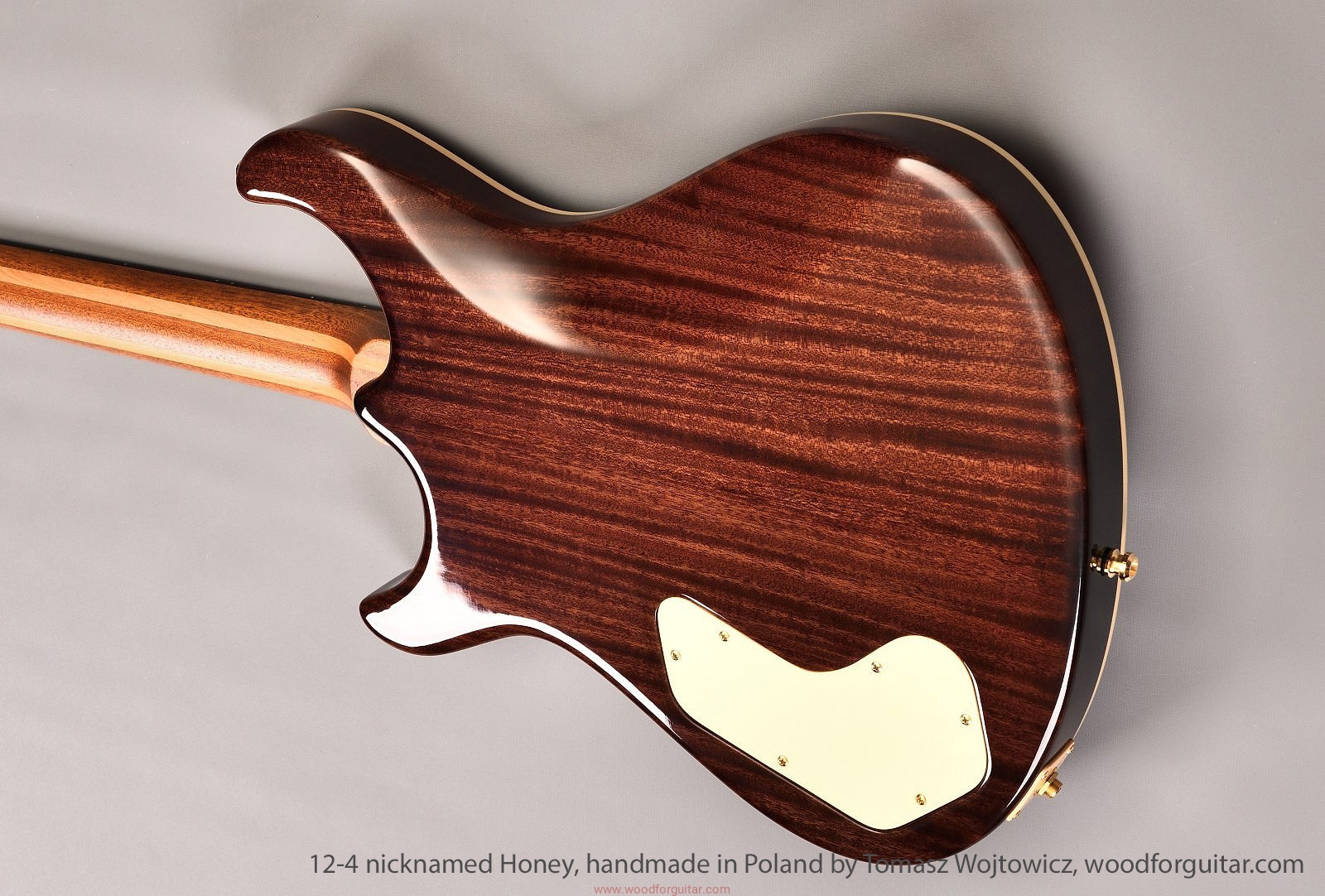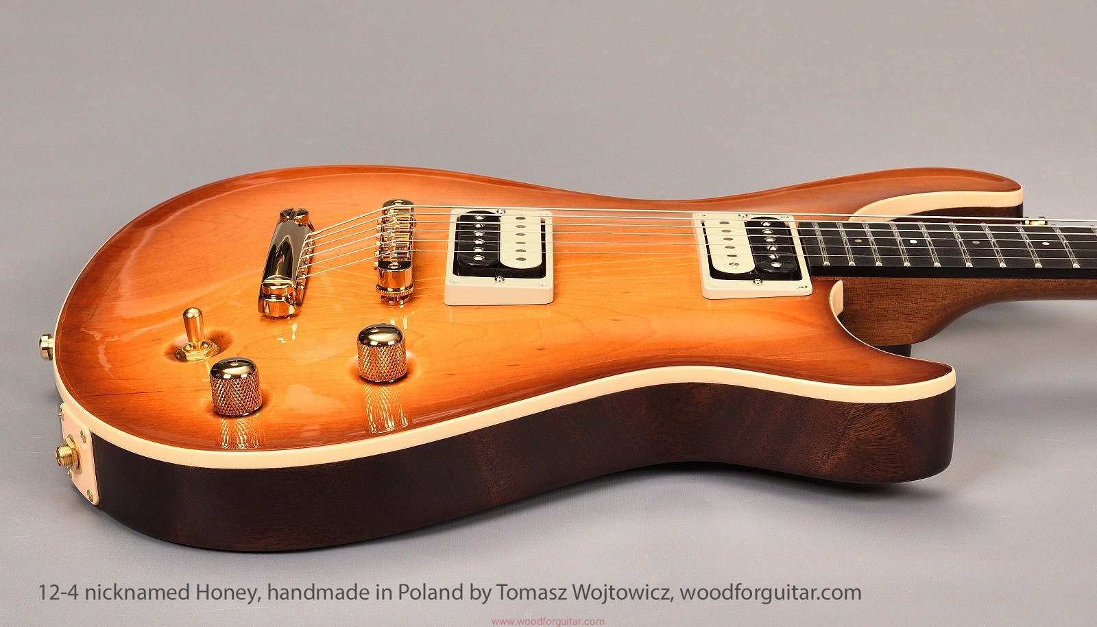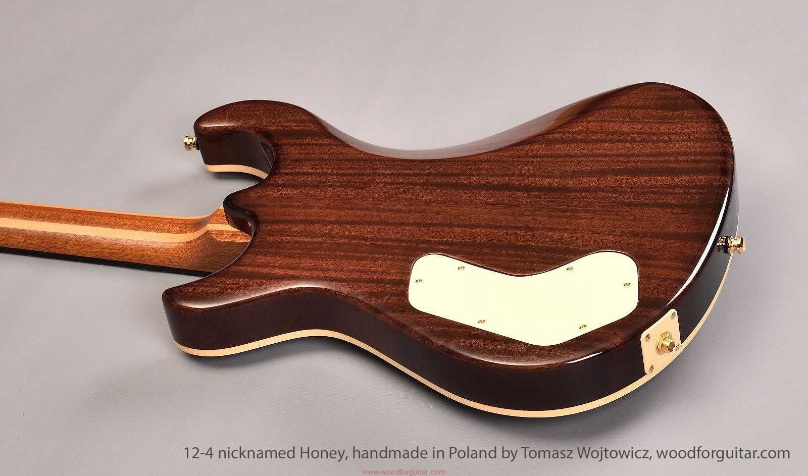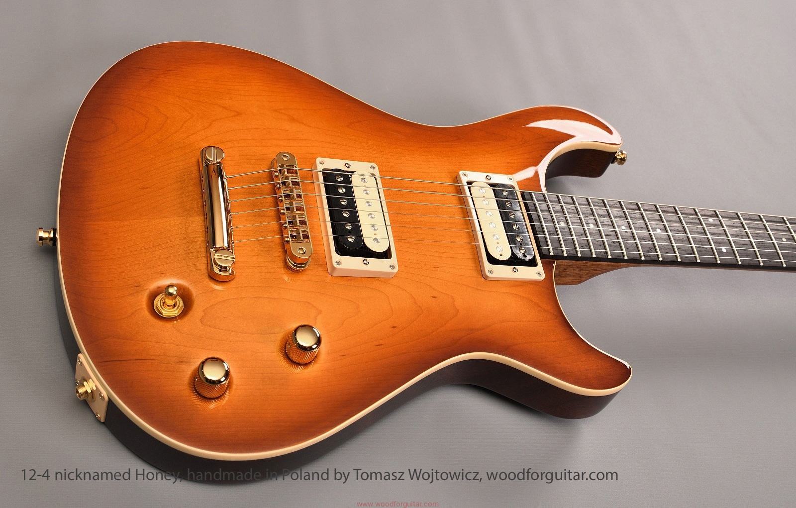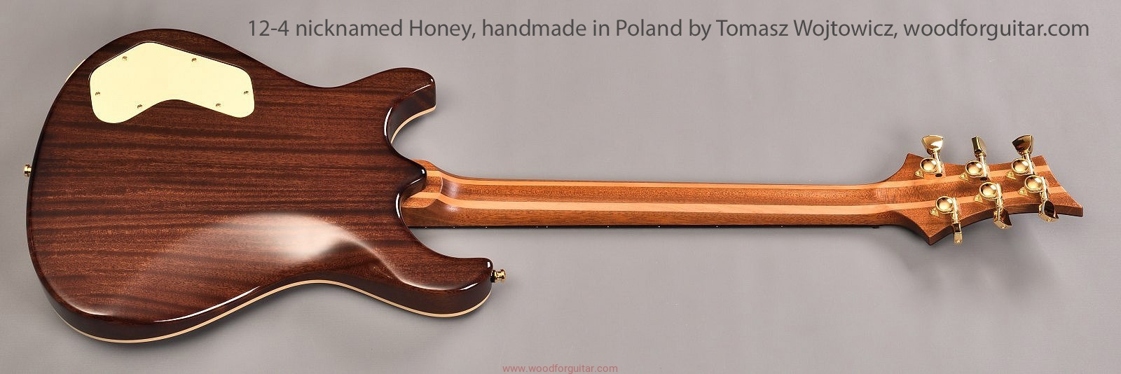Sześciostrunowa gitara elektryczna o numerze seryjnym 12-4, nazwana „Honey”, wykonana ręcznie w Polsce przez Tomasza Wojtowicza, jedna z 25 gitar wchodzących w skład kolekcji „25 guitars collection – handmade by Tomasz Wojtowicz”. Wykonanie gitary zostało całkowicie zakończone w styczniu 2026r, gitara powstawała ponad 17 lat. Dlaczego tak długo? Bo jak zwykle w przypadku gitar z „25 guitars collection” każda z gitar w tej serii powstawała, powstaje i będzie powstawać niespiesznie, w chwilach wyjątkowych… kiedy jest czas i dobra energia. Honey to gitara stworzona do klasycznego rocka oraz bluesa, która została wykonana tradycyjnymi metodami, przy użyciu standardowych, ogólnie dostępnych narzędzi. Zalicza się do instrumentów oldschool’owych, wykonanych ręcznie bez użycia maszyn typu CNC. Dla jednych brzydki, dla innych to piękny efekt połączenia wiedzy, doświadczenia oraz cierpliwości, który jest stworzony głównie do intensywnego grania. W budowie instrumentu użyto klasycznych gatunków drewna wysokiej jakości, sezonowanych przez wiele lat w warunkach suchych. Jest to szczególny, oryginalny instrument, posiadający swój własny charakter, o brzmieniu ciepłym „mahoniowym”, grubym, „drewnianym” z dużą dozą górnolotnego jadu. Konstrukcja gitary, użyte materiały oraz osprzęt sugerują zastosowanie w gatunkach muzycznych, określanych ogólnie jako: classic rock, rock, blues oraz pokrewnych. Oczywiście, tu nie ma granic. W zależności od ustawień czułych potencjometrów, rodzaju i ustawień wzmacniacza, dodatkowych wspomagaczy, … można ukręcić brzmienia do zastosowania w przeróżnych projektach muzycznych. W gitarze zastosowano zestaw jednych z najlepszych na świecie niewoskowanych przetworników typu classic humbucker o niskim poziomie wyjściowym, a także wklejony gryf w standardowych rozmiarach, nie za cienkim, nie za grubym… lecz „w sam raz”. Gitara została wyposażona w osprzęt markowy topowej jakości. Honey to jedenasty instrument uruchomiony w rodzinie „25 guitars collection”, wcześniej uruchomione zostały: Bernard, Winston, Theodore, Leonard, Eddie, Ozzy, Tony, Tweety, Woody oraz Blondie. Pierwsze podłączenie do wzmacniacza ukazało prawdziwą naturę instrumentu, który okazał się być... dziwny. Co powiedziała Honey i dlaczego jest dziwna? „Mogę miękko szeptać. Mogę twardo krzyczeć. Ale nie będę oszukiwać i nie zamaskuję żadnego z twoich potknięć. Powiem więcej… brutalnie je podkreślę, czy to ci się podoba, czy nie”.