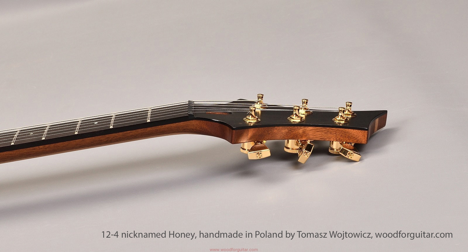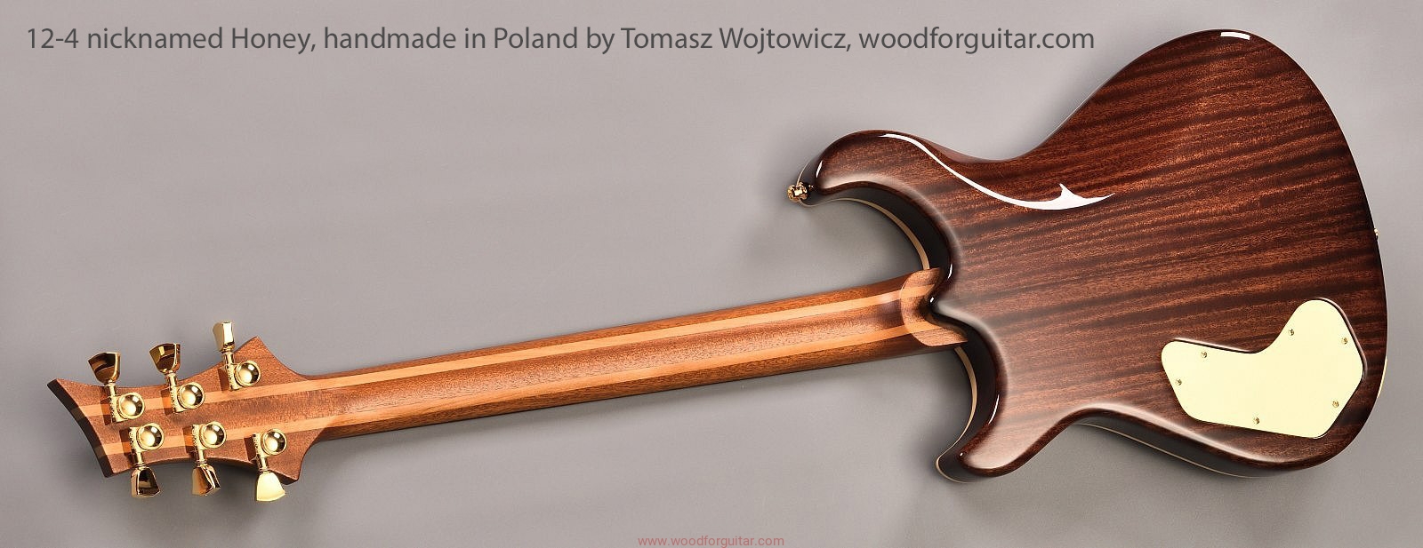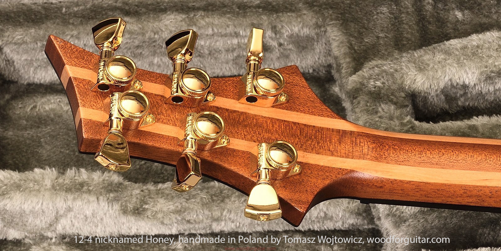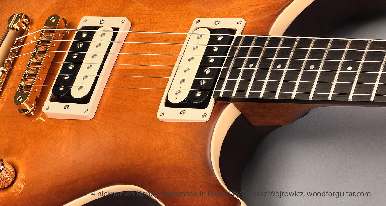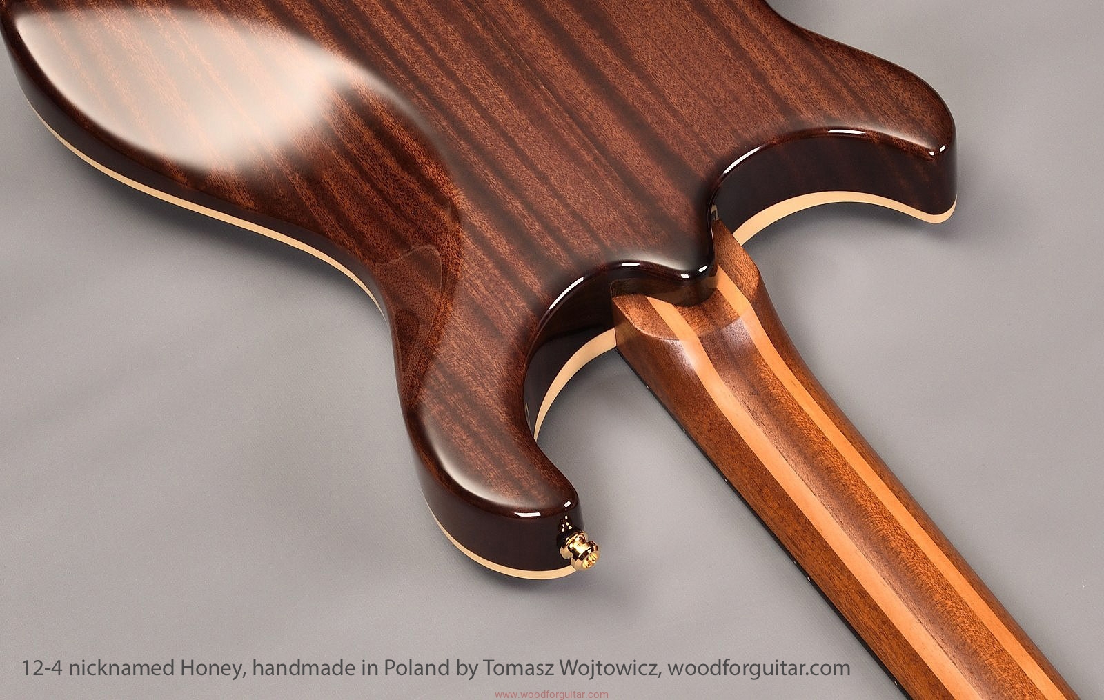 Sześciostrunowa gitara elektryczna o numerze seryjnym 12-4, nazwana „Honey”, wykonana ręcznie w Polsce przez Tomasza Wojtowicza, jedna z 25 gitar wchodzących w skład kolekcji „25 guitars collection – handmade by Tomasz Wojtowicz”. Wykonanie gitary zostało całkowicie zakończone w styczniu 2026r, gitara powstawała ponad 17 lat. Dlaczego tak długo? Bo jak zwykle w przypadku gitar z „25 guitars collection” każda z gitar w tej serii powstawała, powstaje i będzie powstawać niespiesznie, w chwilach wyjątkowych… kiedy jest czas i dobra energia. Honey to gitara stworzona do klasycznego rocka oraz bluesa, która została wykonana tradycyjnymi metodami, przy użyciu standardowych, ogólnie dostępnych narzędzi. Zalicza się do instrumentów oldschool’owych, wykonanych ręcznie bez użycia maszyn typu CNC. Dla jednych brzydki, dla innych to piękny efekt połączenia wiedzy, doświadczenia oraz cierpliwości, który jest stworzony głównie do intensywnego grania. W budowie instrumentu użyto klasycznych gatunków drewna wysokiej jakości, sezonowanych przez wiele lat w warunkach suchych. Jest to szczególny, oryginalny instrument, posiadający swój własny charakter, o brzmieniu ciepłym „mahoniowym”, grubym, „drewnianym” z dużą dozą górnolotnego jadu. Konstrukcja gitary, użyte materiały oraz osprzęt sugerują zastosowanie w gatunkach muzycznych, określanych ogólnie jako: classic rock, rock, blues oraz pokrewnych. Oczywiście, tu nie ma granic. W zależności od ustawień czułych potencjometrów, rodzaju i ustawień wzmacniacza, dodatkowych wspomagaczy, … można ukręcić brzmienia do zastosowania w przeróżnych projektach muzycznych. W gitarze zastosowano zestaw jednych z najlepszych na świecie niewoskowanych przetworników typu classic humbucker o niskim poziomie wyjściowym, a także wklejony gryf w standardowych rozmiarach, nie za cienkim, nie za grubym… lecz „w sam raz”. Gitara została wyposażona w osprzęt markowy topowej jakości. Honey to jedenasty instrument uruchomiony w rodzinie „25 guitars collection”, wcześniej uruchomione zostały: Bernard, Winston, Theodore, Leonard, Eddie, Ozzy, Tony, Tweety, Woody oraz Blondie. Pierwsze podłączenie do wzmacniacza ukazało prawdziwą naturę instrumentu, który okazał się być... dziwny. Co powiedziała Honey i dlaczego jest dziwna? „Mogę miękko szeptać. Mogę twardo krzyczeć. Ale nie będę oszukiwać i nie zamaskuję żadnego z twoich potknięć. Powiem więcej… brutalnie je podkreślę, czy to ci się podoba, czy nie”.
