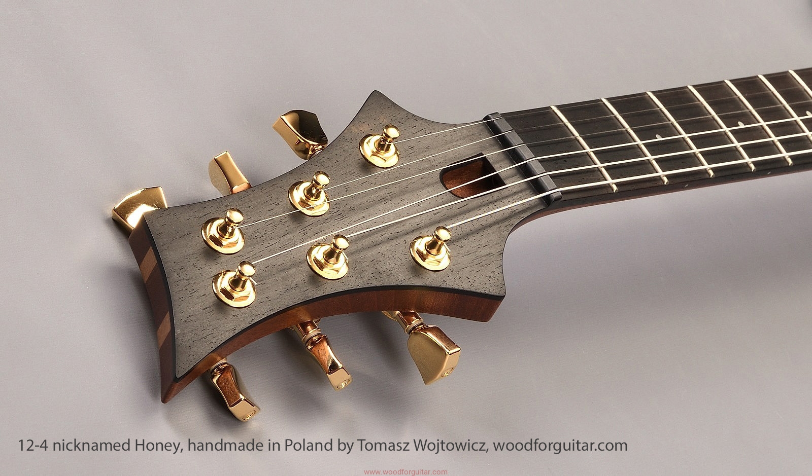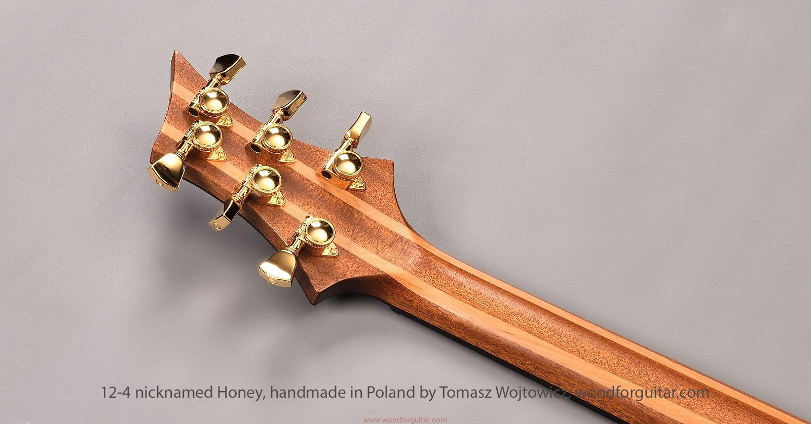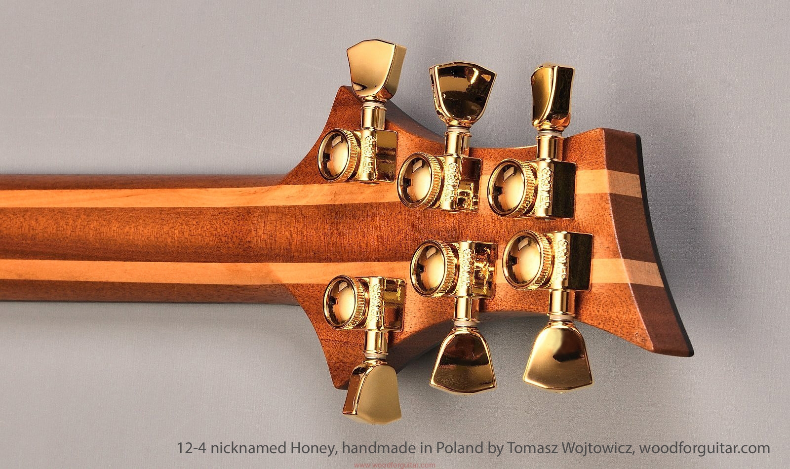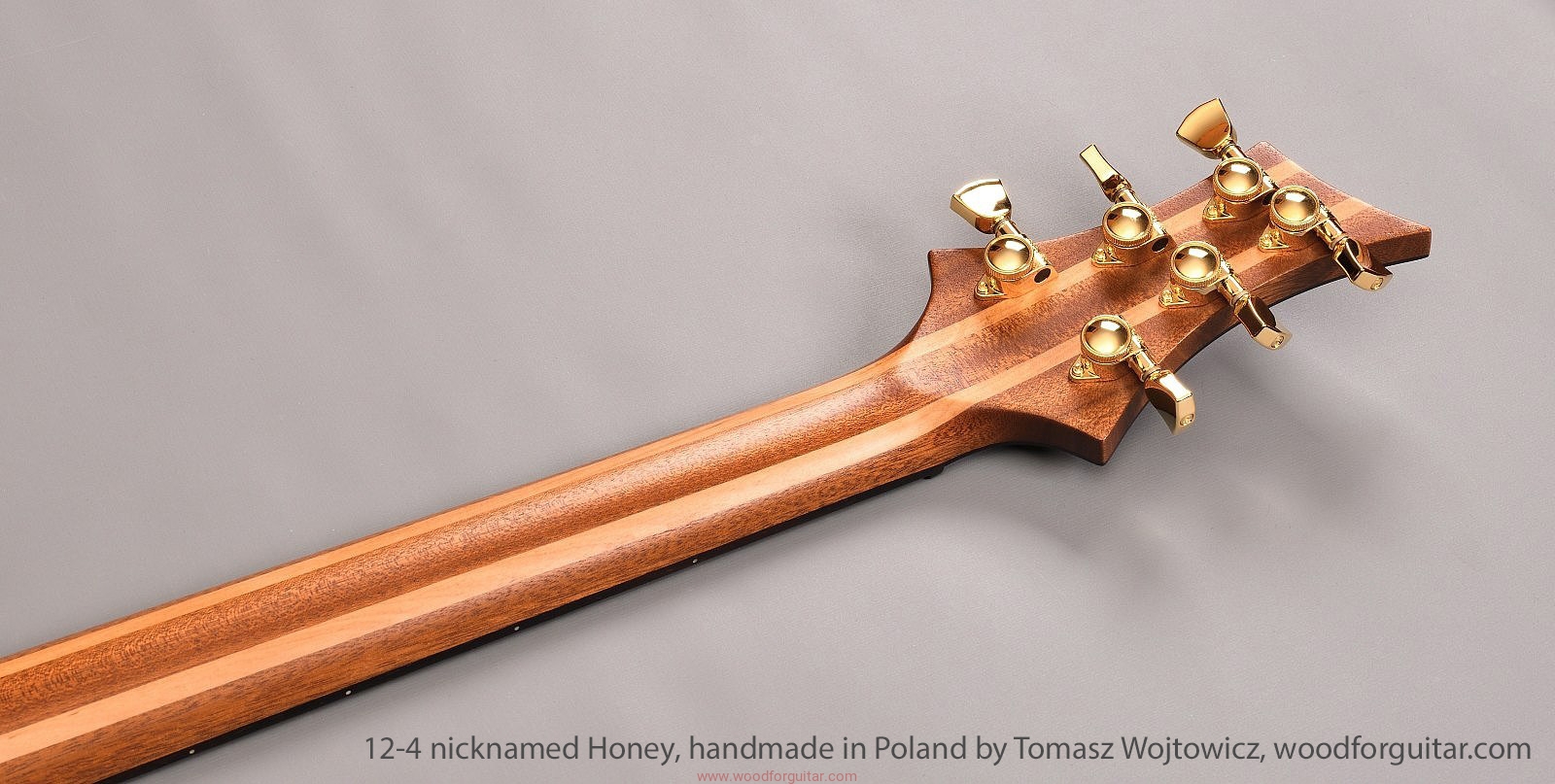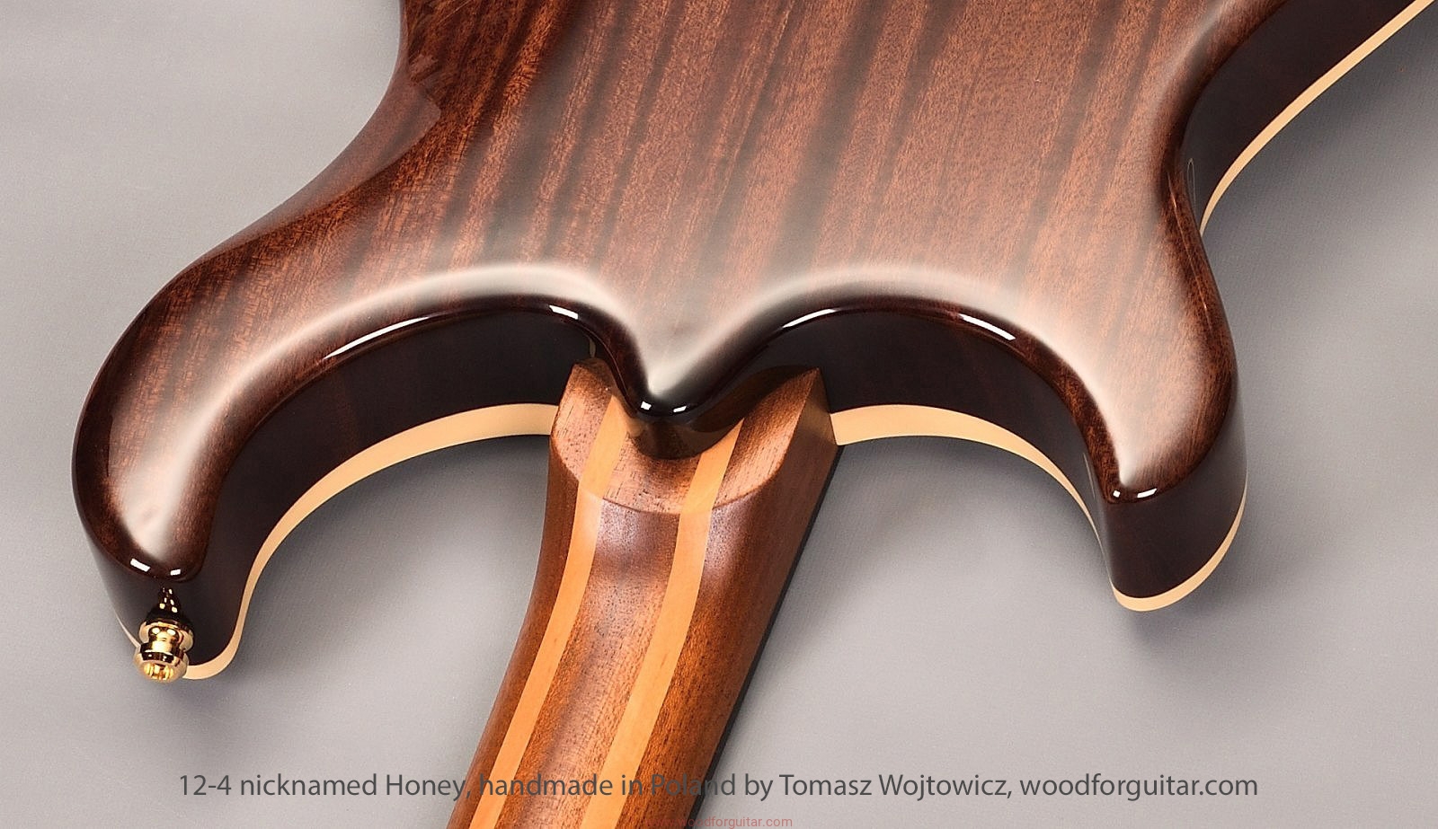 Sześciostrunowa gitara elektryczna o numerze seryjnym 12-4, nazwana „Honey”, wykonana ręcznie w Polsce przez Tomasza Wojtowicza, jedna z 25 gitar wchodzących w skład kolekcji „25 guitars collection – handmade by Tomasz Wojtowicz”. Wykonanie gitary zostało całkowicie zakończone w styczniu 2026r, gitara powstawała ponad 17 lat. Dlaczego tak długo? Bo jak zwykle w przypadku gitar z „25 guitars collection” każda z gitar w tej serii powstawała, powstaje i będzie powstawać niespiesznie, w chwilach wyjątkowych… kiedy jest czas i dobra energia. Honey to gitara stworzona do klasycznego rocka oraz bluesa, która została wykonana tradycyjnymi metodami, przy użyciu standardowych, ogólnie dostępnych narzędzi. Zalicza się do instrumentów oldschool’owych, wykonanych ręcznie bez użycia maszyn typu CNC. Dla jednych brzydki, dla innych to piękny efekt połączenia wiedzy, doświadczenia oraz cierpliwości, który jest stworzony głównie do intensywnego grania. W budowie instrumentu użyto klasycznych gatunków drewna wysokiej jakości, sezonowanych przez wiele lat w warunkach suchych. Jest to szczególny, oryginalny instrument, posiadający swój własny charakter, o brzmieniu ciepłym „mahoniowym”, grubym, „drewnianym” z dużą dozą górnolotnego jadu. Konstrukcja gitary, użyte materiały oraz osprzęt sugerują zastosowanie w gatunkach muzycznych, określanych ogólnie jako: classic rock, rock, blues oraz pokrewnych. Oczywiście, tu nie ma granic. W zależności od ustawień czułych potencjometrów, rodzaju i ustawień wzmacniacza, dodatkowych wspomagaczy, … można ukręcić brzmienia do zastosowania w przeróżnych projektach muzycznych. W gitarze zastosowano zestaw jednych z najlepszych na świecie niewoskowanych przetworników typu classic humbucker o niskim poziomie wyjściowym, a także wklejony gryf w standardowych rozmiarach, nie za cienkim, nie za grubym… lecz „w sam raz”. Gitara została wyposażona w osprzęt markowy topowej jakości. Honey to jedenasty instrument uruchomiony w rodzinie „25 guitars collection”, wcześniej uruchomione zostały: Bernard, Winston, Theodore, Leonard, Eddie, Ozzy, Tony, Tweety, Woody oraz Blondie. Pierwsze podłączenie do wzmacniacza ukazało prawdziwą naturę instrumentu, który okazał się być... dziwny. Co powiedziała Honey i dlaczego jest dziwna? „Mogę miękko szeptać. Mogę twardo krzyczeć. Ale nie będę oszukiwać i nie zamaskuję żadnego z twoich potknięć. Powiem więcej… brutalnie je podkreślę, czy to ci się podoba, czy nie”.