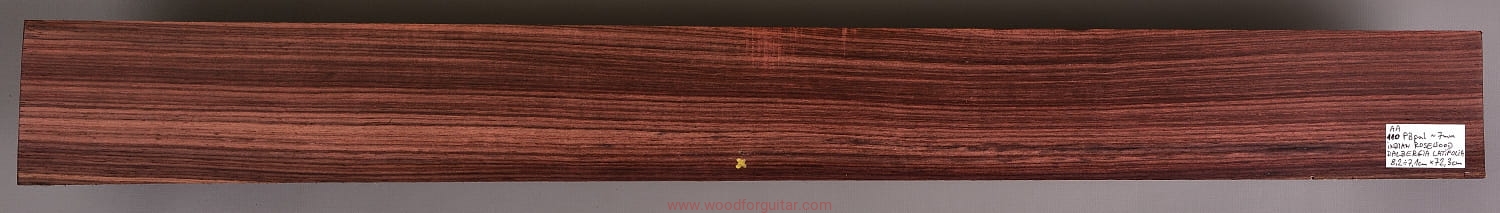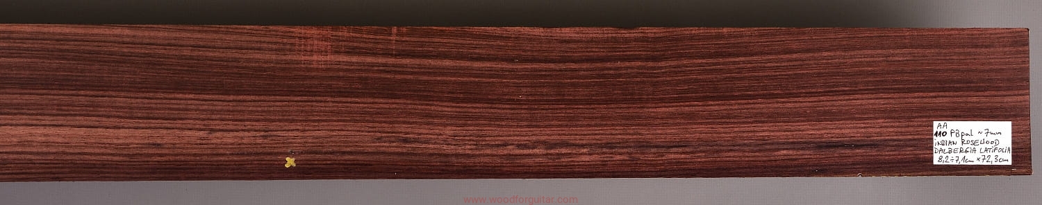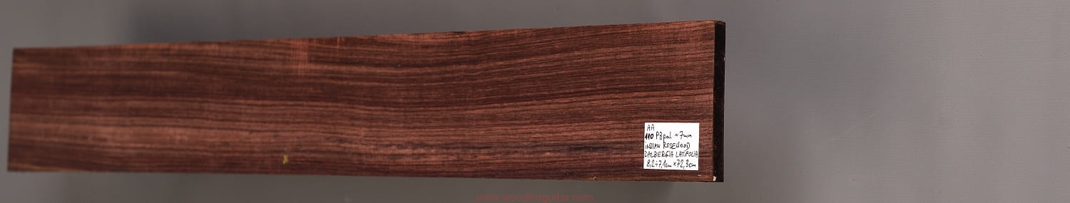 Bardzo popularne i klasyczne drewno, używane od lat głównie na podstrunnice w gitarach elektrycznych, basowych oraz akustycznych. Jak wskazuje nazwa, pochodzi głównie z Indii, ale także rośnie i jest pozyskiwane na Sri Lance oraz w Indonezji. Tonalnie palisander indyjski jest określany jako ciepłobrzmiący, nie oznacza to jednak, że brakuje mu tzw. góry. Kiedy potrzeba generuje zaokrąglone łagodnie brzmiące wysokie przydźwięki i idealnie sprawdza się w instrumentach przeznaczonych do muzyki bluesowej, rockowej lub w instrumentach uniwersalnych. Drewno jest stosunkowo tanie (raczej już niestety było tanie), jednak wysokiej klasy kawałki osiągają ceny porównywalne z czarnym hebanem, dotyczy to również kawałków unikalnych, o specyficznych cechach. Kawałek na podstrunnicę może kosztować 15 dolarów, ale może też kosztować 50 dolarów oraz znacznie więcej. Wygląd palisandra indyjskiego lubi się znacznie różnić. W zależności m.in. od warunków w jakich rosło drzewo, drewno przybiera barwę prawie czarną z ciemno-brązowymi pręgami, najczęściej jednak ma charakterystyczne zabarwienie brązowe, przechodzące w ciemny fiolet, czasami z jaśniejszymi beżowo-żółto-czerwonymi akcentami/pręgami. Łatwe w obróbce, pięknie pachnie, a z powodu dużej zawartości olejków własnych nie wymaga lakierowania. W gotowym instrumencie do czyszczenia i impregnowania wystarczy tylko używać popularnego olejku cytrynowego. Po wyszlifowaniu jest aksamitne w dotyku z wyczuwalnymi porami. Drewno jest mocne, twarde, odporne na ścieranie, pory drewna są dosyć duże i szerokie. Palisander indyjski to wspaniałe i magiczne drewno, które słyszymy w muzyce od pokoleń. Niestety, wieloletnie niekontrolowane masowe wycinki drzew tego gatunku doprowadziły do zbyt daleko posuniętego zaniku palisandra indyjskiego w przyrodzie, dlatego podjęto decyzję o objęciu tego gatunku szczególną ochroną i wpisaniu go na listę gatunków zagrożonych (CITES). Sprzedaż gatunku Dalbergia latifolia prowadzimy tylko do krajów Unii Europejskiej, proszę mieć na uwadze, że wszelkie przekroczenia granicy UE instrumentu z nawet niewielkim elementem wykonanym z tego drewna z/do Unii Europejskiej wymagają specjalnych pozwoleń Ministerstwa Środowiska lub odpowiednika tej instytucji w danym kraju. Brak pozwoleń skutkuje zarekwirowaniem drewna lub całego instrumentu przez służby celne.