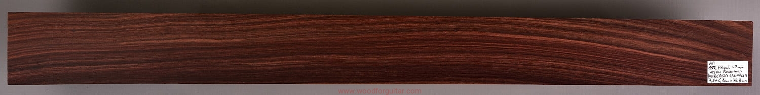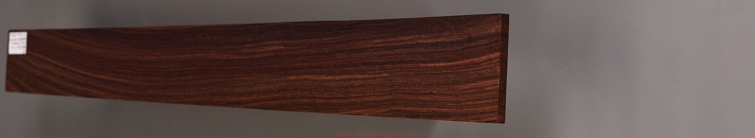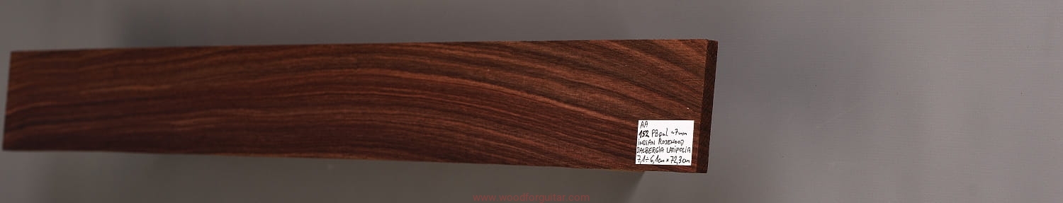 Bardzo popularne i klasyczne drewno, używane od lat głównie na podstrunnice w gitarach elektrycznych, basowych oraz akustycznych. Jak wskazuje nazwa, pochodzi głównie z Indii, ale także rośnie i jest pozyskiwane na Sri Lance oraz w Indonezji. Tonalnie palisander indyjski jest określany jako ciepłobrzmiący, nie oznacza to jednak, że brakuje mu tzw. góry. Kiedy potrzeba generuje zaokrąglone łagodnie brzmiące wysokie przydźwięki i idealnie sprawdza się w instrumentach przeznaczonych do muzyki bluesowej, rockowej lub w instrumentach uniwersalnych. Drewno jest stosunkowo tanie (raczej już niestety było tanie), jednak wysokiej klasy kawałki osiągają ceny porównywalne z czarnym hebanem, dotyczy to również kawałków unikalnych, o specyficznych cechach. Kawałek na podstrunnicę może kosztować 15 dolarów, ale może też kosztować 50 dolarów oraz znacznie więcej. Wygląd palisandra indyjskiego lubi się znacznie różnić. W zależności m.in. od warunków w jakich rosło drzewo, drewno przybiera barwę prawie czarną z ciemno-brązowymi pręgami, najczęściej jednak ma charakterystyczne zabarwienie brązowe, przechodzące w ciemny fiolet, czasami z jaśniejszymi beżowo-żółto-czerwonymi akcentami/pręgami. Łatwe w obróbce, pięknie pachnie, a z powodu dużej zawartości olejków własnych nie wymaga lakierowania. W gotowym instrumencie do czyszczenia i impregnowania wystarczy tylko używać popularnego olejku cytrynowego. Po wyszlifowaniu jest aksamitne w dotyku z wyczuwalnymi porami. Drewno jest mocne, twarde, odporne na ścieranie, pory drewna są dosyć duże i szerokie. Palisander indyjski to wspaniałe i magiczne drewno, które słyszymy w muzyce od pokoleń. Niestety, wieloletnie niekontrolowane masowe wycinki drzew tego gatunku doprowadziły do zbyt daleko posuniętego zaniku palisandra indyjskiego w przyrodzie, dlatego podjęto decyzję o objęciu tego gatunku szczególną ochroną i wpisaniu go na listę gatunków zagrożonych (CITES). Sprzedaż gatunku Dalbergia latifolia prowadzimy tylko do krajów Unii Europejskiej, proszę mieć na uwadze, że wszelkie przekroczenia granicy UE instrumentu z nawet niewielkim elementem wykonanym z tego drewna z/do Unii Europejskiej wymagają specjalnych pozwoleń Ministerstwa Środowiska lub odpowiednika tej instytucji w danym kraju. Brak pozwoleń skutkuje zarekwirowaniem drewna lub całego instrumentu przez służby celne.