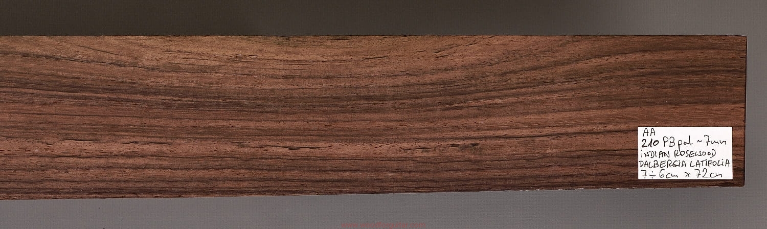 Bardzo popularne i klasyczne drewno, używane od lat głównie na podstrunnice w gitarach elektrycznych, basowych oraz akustycznych. Jak wskazuje nazwa, pochodzi głównie z Indii, ale także rośnie i jest pozyskiwane na Sri Lance oraz w Indonezji. Tonalnie palisander indyjski jest określany jako ciepłobrzmiący, nie oznacza to jednak, że brakuje mu tzw. góry. Kiedy potrzeba generuje zaokrąglone łagodnie brzmiące wysokie przydźwięki i idealnie sprawdza się w instrumentach przeznaczonych do muzyki bluesowej, rockowej lub w instrumentach uniwersalnych. Drewno jest stosunkowo tanie (raczej już niestety było tanie), jednak wysokiej klasy kawałki osiągają ceny porównywalne z czarnym hebanem, dotyczy to również kawałków unikalnych, o specyficznych cechach. Kawałek na podstrunnicę może kosztować 15 dolarów, ale może też kosztować 50 dolarów oraz znacznie więcej. Wygląd palisandra indyjskiego lubi się znacznie różnić. W zależności m.in. od warunków w jakich rosło drzewo, drewno przybiera barwę prawie czarną z ciemno-brązowymi pręgami, najczęściej jednak ma charakterystyczne zabarwienie brązowe, przechodzące w ciemny fiolet, czasami z jaśniejszymi beżowo-żółto-czerwonymi akcentami/pręgami. Łatwe w obróbce, pięknie pachnie, a z powodu dużej zawartości olejków własnych nie wymaga lakierowania. W gotowym instrumencie do czyszczenia i impregnowania wystarczy tylko używać popularnego olejku cytrynowego. Po wyszlifowaniu jest aksamitne w dotyku z wyczuwalnymi porami. Drewno jest mocne, twarde, odporne na ścieranie, pory drewna są dosyć duże i szerokie. Palisander indyjski to wspaniałe i magiczne drewno, które słyszymy w muzyce od pokoleń. Niestety, wieloletnie niekontrolowane masowe wycinki drzew tego gatunku doprowadziły do zbyt daleko posuniętego zaniku palisandra indyjskiego w przyrodzie, dlatego podjęto decyzję o objęciu tego gatunku szczególną ochroną i wpisaniu go na listę gatunków zagrożonych (CITES). Sprzedaż gatunku Dalbergia latifolia prowadzimy tylko do krajów Unii Europejskiej, proszę mieć na uwadze, że wszelkie przekroczenia granicy UE instrumentu z nawet niewielkim elementem wykonanym z tego drewna z/do Unii Europejskiej wymagają specjalnych pozwoleń Ministerstwa Środowiska lub odpowiednika tej instytucji w danym kraju. Brak pozwoleń skutkuje zarekwirowaniem drewna lub całego instrumentu przez służby celne.