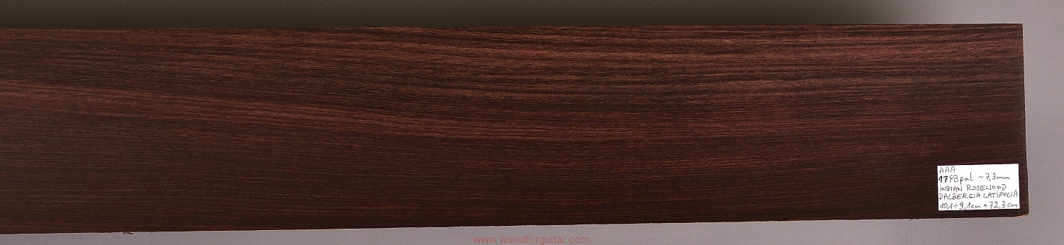 Bardzo popularne i klasyczne drewno, używane od lat głównie na podstrunnice w gitarach elektrycznych, basowych oraz akustycznych. Jak wskazuje nazwa, pochodzi głównie z Indii, ale także rośnie i jest pozyskiwane na Sri Lance oraz w Indonezji. Tonalnie palisander indyjski jest określany jako ciepłobrzmiący, nie oznacza to jednak, że brakuje mu tzw. góry. Kiedy potrzeba generuje zaokrąglone łagodnie brzmiące wysokie przydźwięki i idealnie sprawdza się w instrumentach przeznaczonych do muzyki bluesowej, rockowej lub w instrumentach uniwersalnych. Drewno jest stosunkowo tanie (raczej już niestety było tanie), jednak wysokiej klasy kawałki osiągają ceny porównywalne z czarnym hebanem, dotyczy to również kawałków unikalnych, o specyficznych cechach. Kawałek na podstrunnicę może kosztować 15 dolarów, ale może też kosztować 50 dolarów oraz znacznie więcej. Wygląd palisandra indyjskiego lubi się znacznie różnić. W zależności m.in. od warunków w jakich rosło drzewo, drewno przybiera barwę prawie czarną z ciemno-brązowymi pręgami, najczęściej jednak ma charakterystyczne zabarwienie brązowe, przechodzące w ciemny fiolet, czasami z jaśniejszymi beżowo-żółto-czerwonymi akcentami/pręgami. Łatwe w obróbce, pięknie pachnie, a z powodu dużej zawartości olejków własnych nie wymaga lakierowania. W gotowym instrumencie do czyszczenia i impregnowania wystarczy tylko używać popularnego olejku cytrynowego. Po wyszlifowaniu jest aksamitne w dotyku z wyczuwalnymi porami. Drewno jest mocne, twarde, odporne na ścieranie, pory drewna są dosyć duże i szerokie. Palisander indyjski to wspaniałe i magiczne drewno, które słyszymy w muzyce od pokoleń. Niestety, wieloletnie niekontrolowane masowe wycinki drzew tego gatunku doprowadziły do zbyt daleko posuniętego zaniku palisandra indyjskiego w przyrodzie, dlatego podjęto decyzję o objęciu tego gatunku szczególną ochroną i wpisaniu go na listę gatunków zagrożonych (CITES). Sprzedaż gatunku Dalbergia latifolia prowadzimy tylko do krajów Unii Europejskiej, proszę mieć na uwadze, że wszelkie przekroczenia granicy UE instrumentu z nawet niewielkim elementem wykonanym z tego drewna z/do Unii Europejskiej wymagają specjalnych pozwoleń Ministerstwa Środowiska lub odpowiednika tej instytucji w danym kraju. Brak pozwoleń skutkuje zarekwirowaniem drewna lub całego instrumentu przez służby celne.