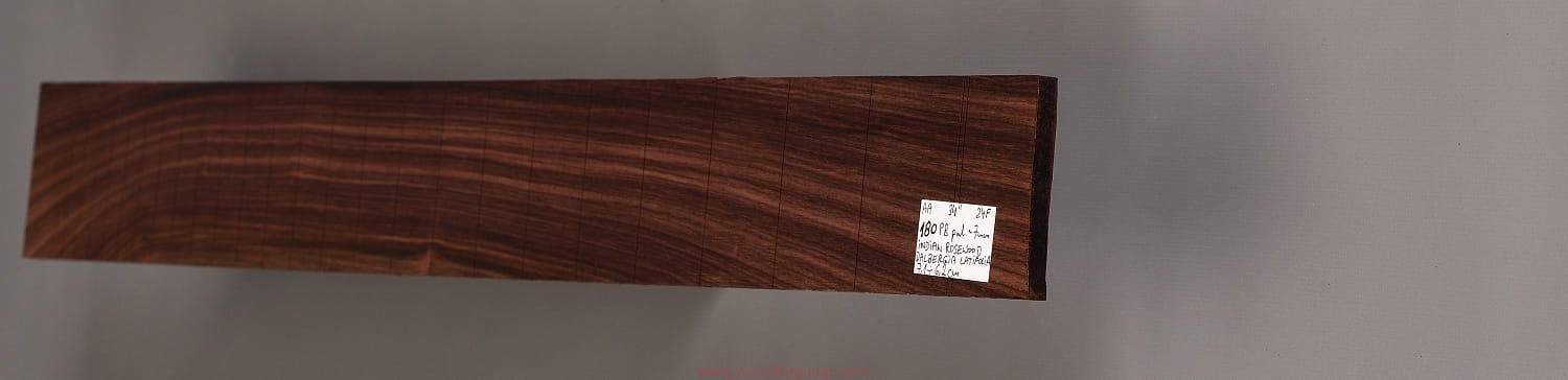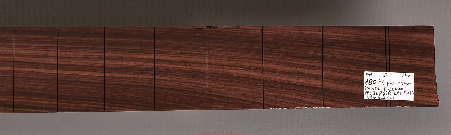 Bardzo popularne i klasyczne drewno, używane od lat głównie na podstrunnice w gitarach elektrycznych, basowych oraz akustycznych. Jak wskazuje nazwa, pochodzi głównie z Indii, ale także rośnie i jest pozyskiwane na Sri Lance oraz w Indonezji. Tonalnie palisander indyjski jest określany jako ciepłobrzmiący, nie oznacza to jednak, że brakuje mu tzw. góry. Kiedy potrzeba generuje zaokrąglone łagodnie brzmiące wysokie przydźwięki i idealnie sprawdza się w instrumentach przeznaczonych do muzyki bluesowej, rockowej lub w instrumentach uniwersalnych. Drewno jest stosunkowo tanie (raczej już niestety było tanie), jednak wysokiej klasy kawałki osiągają ceny porównywalne z czarnym hebanem, dotyczy to również kawałków unikalnych, o specyficznych cechach. Kawałek na podstrunnicę może kosztować 15 dolarów, ale może też kosztować 50 dolarów oraz znacznie więcej. Wygląd palisandra indyjskiego lubi się znacznie różnić. W zależności m.in. od warunków w jakich rosło drzewo, drewno przybiera barwę prawie czarną z ciemno-brązowymi pręgami, najczęściej jednak ma charakterystyczne zabarwienie brązowe, przechodzące w ciemny fiolet, czasami z jaśniejszymi beżowo-żółto-czerwonymi akcentami/pręgami. Łatwe w obróbce, pięknie pachnie, a z powodu dużej zawartości olejków własnych nie wymaga lakierowania. W gotowym instrumencie do czyszczenia i impregnowania wystarczy tylko używać popularnego olejku cytrynowego. Po wyszlifowaniu jest aksamitne w dotyku z wyczuwalnymi porami. Drewno jest mocne, twarde, odporne na ścieranie, pory drewna są dosyć duże i szerokie. Palisander indyjski to wspaniałe i magiczne drewno, które słyszymy w muzyce od pokoleń. Niestety, wieloletnie niekontrolowane masowe wycinki drzew tego gatunku doprowadziły do zbyt daleko posuniętego zaniku palisandra indyjskiego w przyrodzie, dlatego podjęto decyzję o objęciu tego gatunku szczególną ochroną i wpisaniu go na listę gatunków zagrożonych (CITES). Sprzedaż gatunku Dalbergia latifolia prowadzimy tylko do krajów Unii Europejskiej, proszę mieć na uwadze, że wszelkie przekroczenia granicy UE instrumentu z nawet niewielkim elementem wykonanym z tego drewna z/do Unii Europejskiej wymagają specjalnych pozwoleń Ministerstwa Środowiska lub odpowiednika tej instytucji w danym kraju. Brak pozwoleń skutkuje zarekwirowaniem drewna lub całego instrumentu przez służby celne.